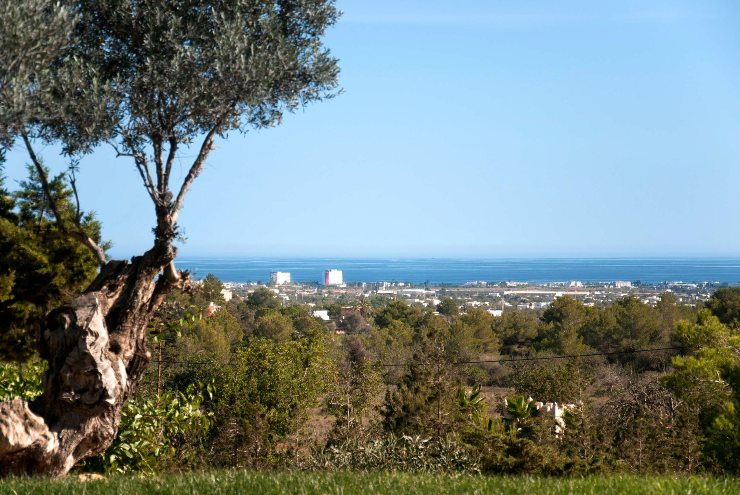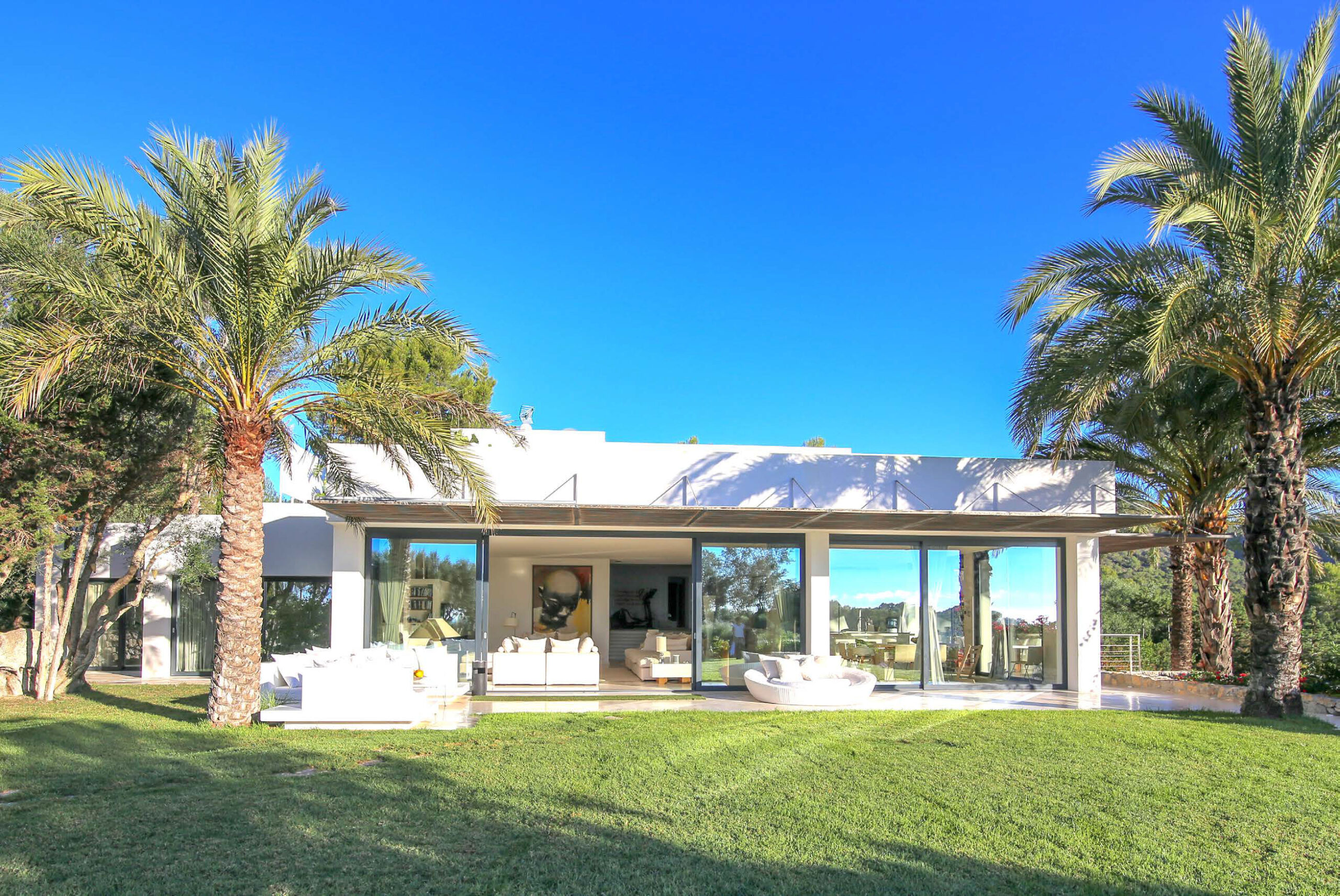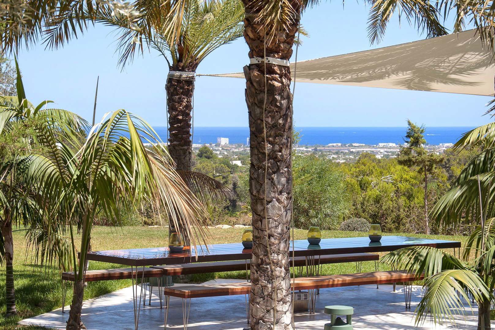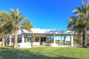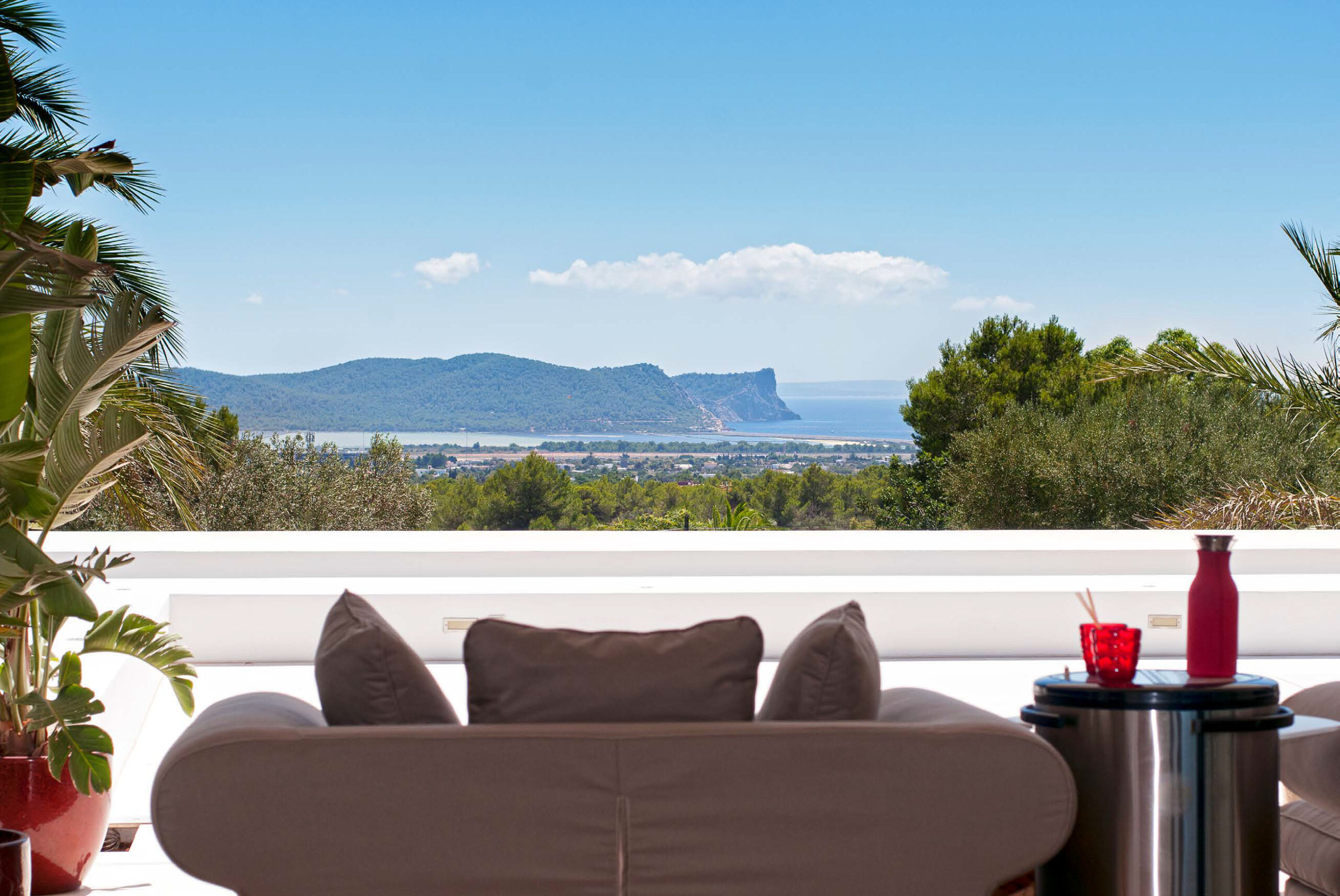 The ultimate private luxury villa offering all you need to enjoy a sun drenched Ibiza vacation with views on surrounding azure Mediterranean waters and the island of Formentera. Located in the South, enclosed by lush green hills near Ibiza town comfortable near to many of the white sandy beaches and neighbouring the big marinas, major restaurants and the electrifying night venues the island. Ultra modern 600sqm villa located 4km from Ibiza town with panoramic views overlooking the famous Ibiza salt flats, Cap Falco, Playa den Bossa and the island of Formentera. Set on 30,000m2 of land with terraces, the villa has huge open living spaces, bright bedrooms and an amazing 17m swimming pool. On the ground floor there is a generous living space with floor-to-ceiling glass doors, open plan kitchen & dining area with panoramic sea-views, a separate living / TV-Room with PlayStation and 4 x bedrooms with queen size beds, dressing areas and en-suite bathrooms. On the first floor there is a studio with 2 rooms with queen size beds, en-suite bathroom with shower and steam bath, living area and large terrace facing East, South & West overlooking Playa d’en Bossa, the Salt flats & the Island of Formentera. In the basement there is 1 x air-conditioned Staff room with shower & toilet Guest toilet