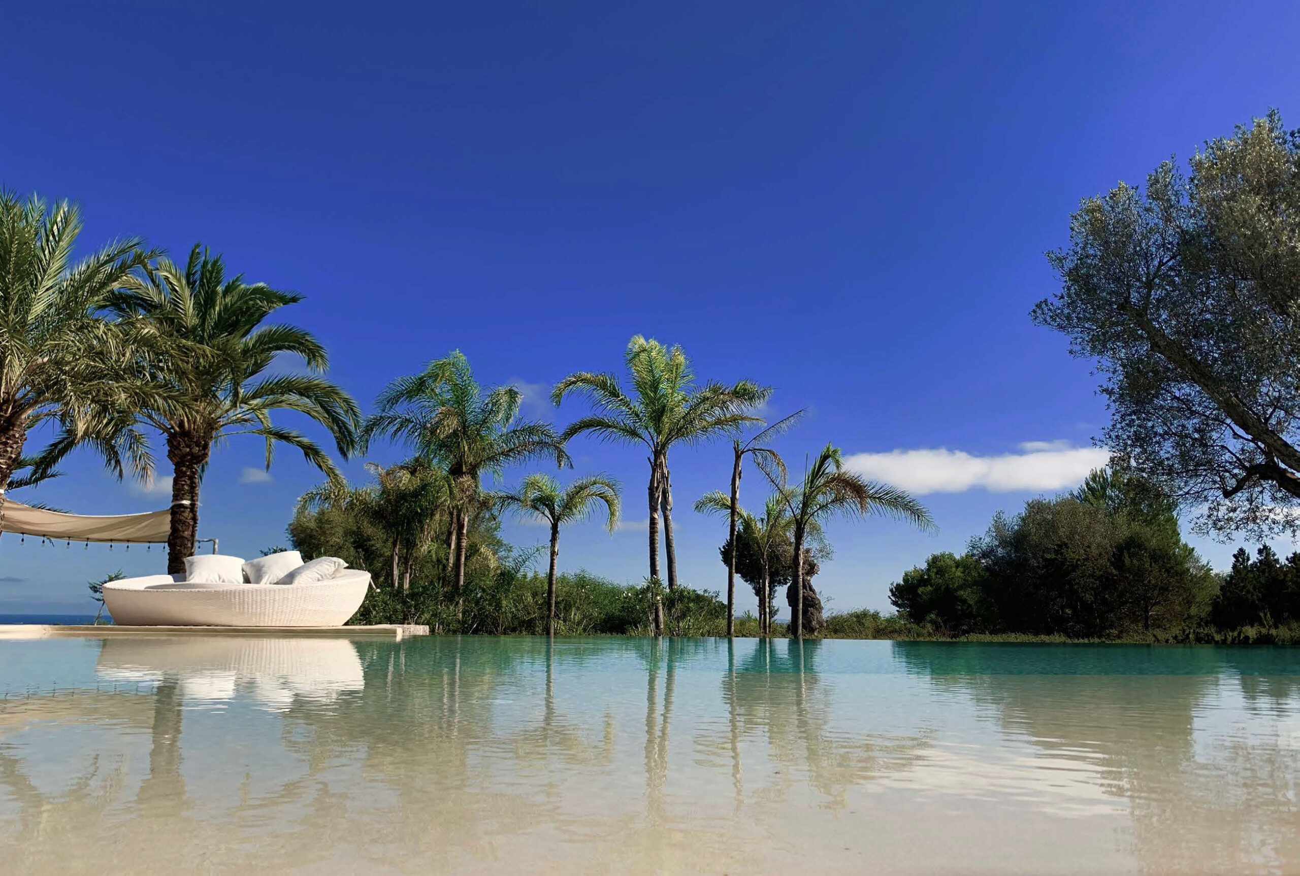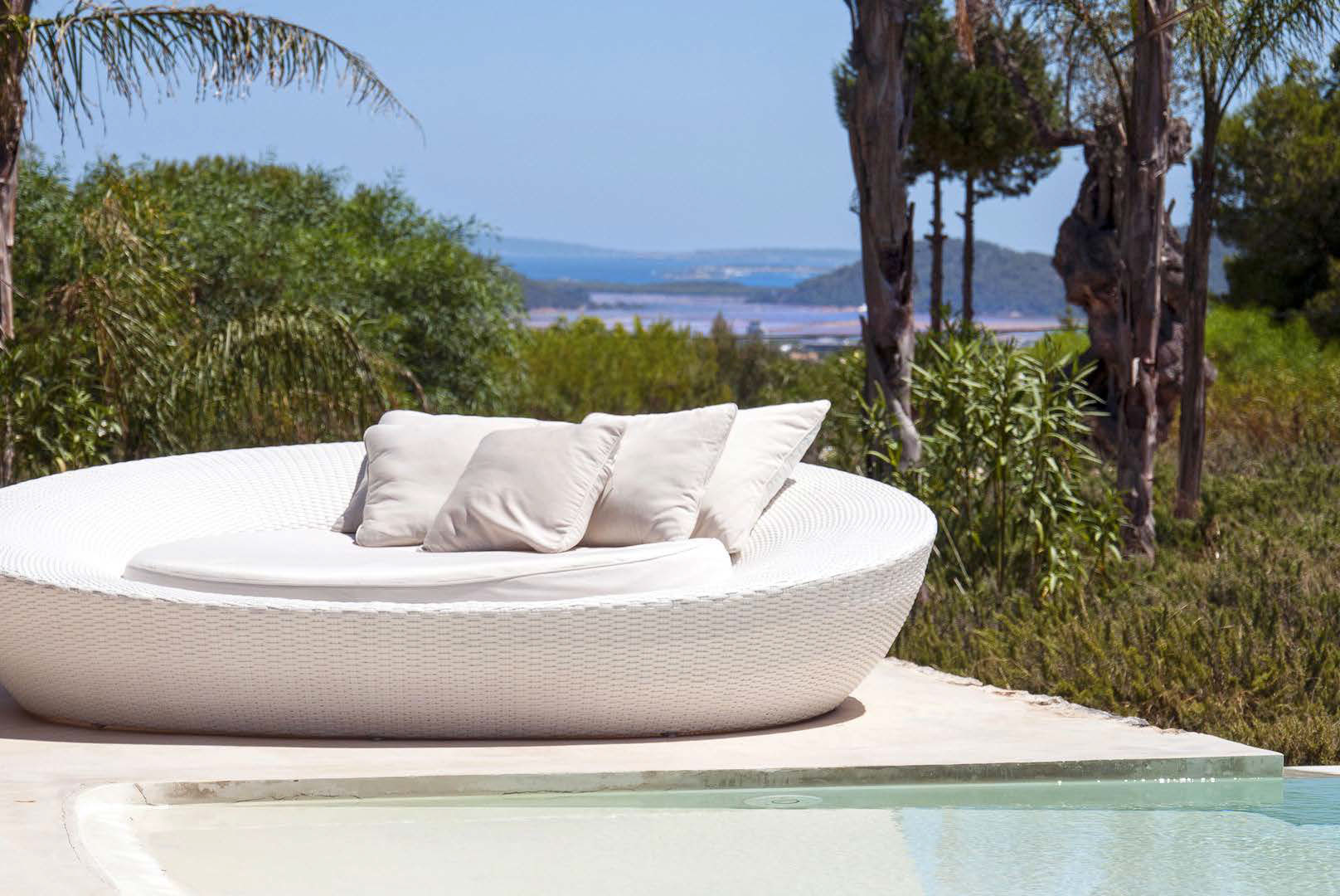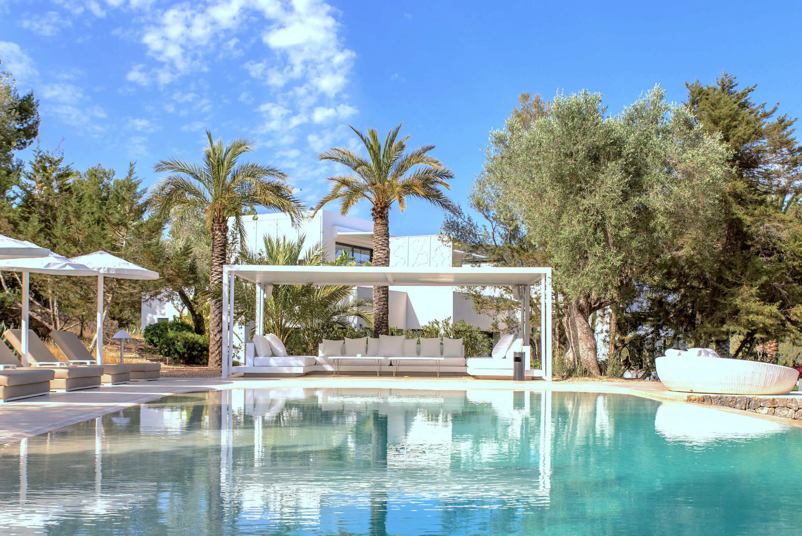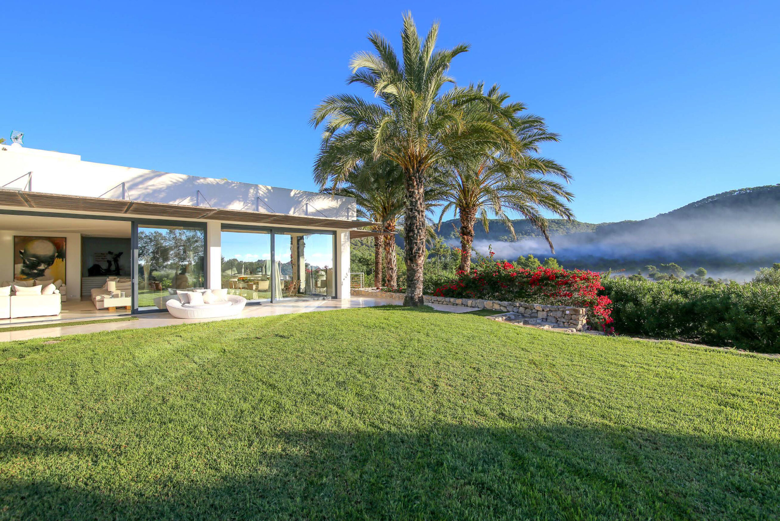 The ultimate private luxury villa offering all you need to enjoy a sun drenched Ibiza vacation with views on surrounding azure Mediterranean waters and the island of Formentera. Located in the South, enclosed by lush green hills near Ibiza town comfortable near to many of the white sandy beaches and neighbouring the big marinas, major restaurants and the electrifying night venues the island. Ultra modern 600sqm villa located 4km from Ibiza town with panoramic views overlooking the famous Ibiza salt flats, Cap Falco, Playa den Bossa and the island of Formentera. Set on 30,000m2 of land with terraces, the villa has huge open living spaces, bright bedrooms and an amazing 17m swimming pool. On the ground floor there is a generous living space with floor-to-ceiling glass doors, open plan kitchen & dining area with panoramic sea-views, a separate living / TV-Room with PlayStation and 4 x bedrooms with queen size beds, dressing areas and en-suite bathrooms. On the first floor there is a studio with 2 rooms with queen size beds, en-suite bathroom with shower and steam bath, living area and large terrace facing East, South & West overlooking Playa d’en Bossa, the Salt flats & the Island of Formentera. In the basement there is 1 x air-conditioned Staff room with shower & toilet Guest toilet