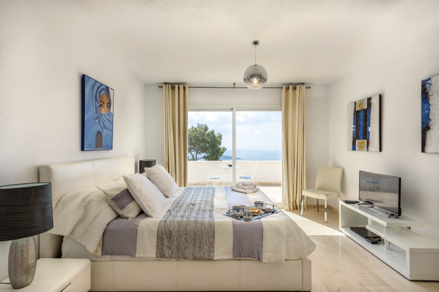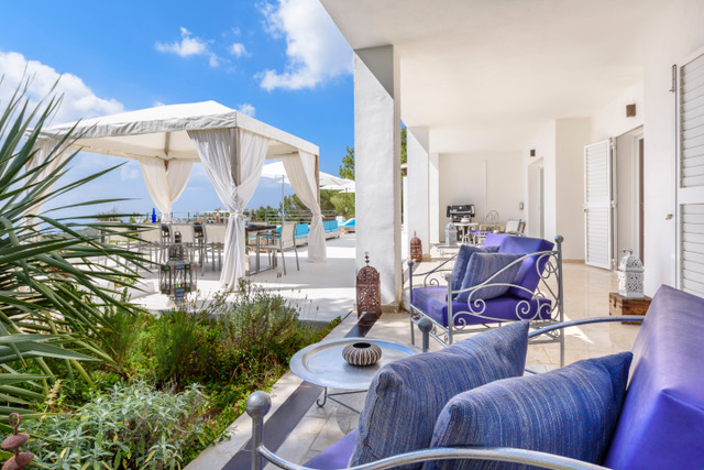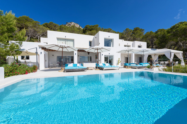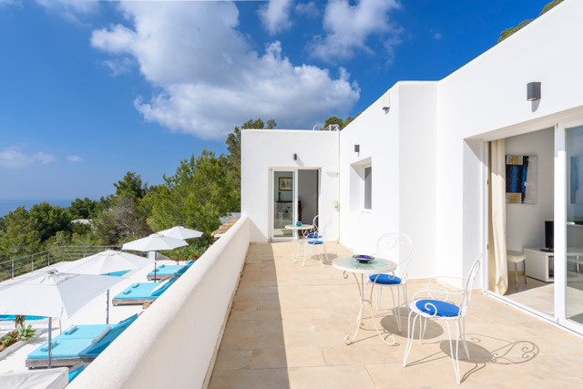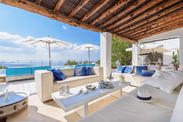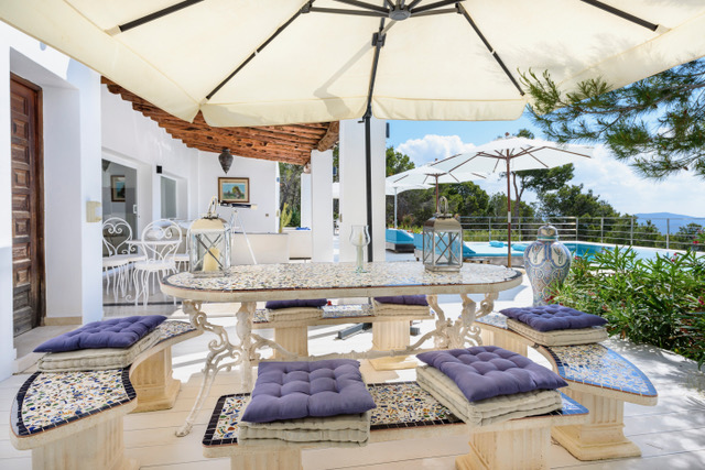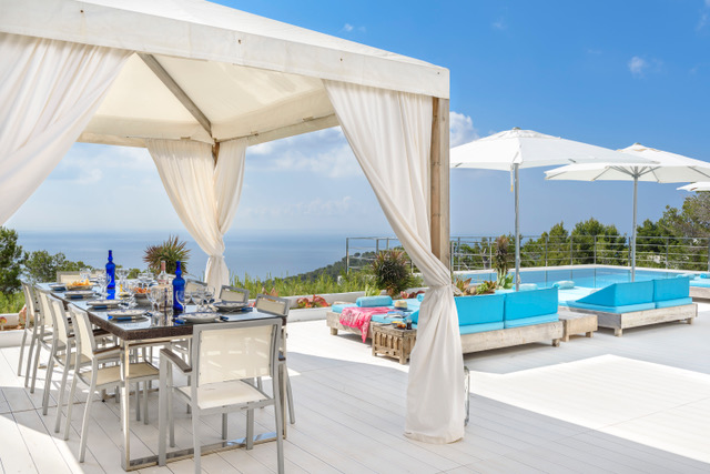 A charming, but chic and luxury villa built on the hills of Es Cubells, about 10 mins from San Jose and Cala Jondal beach ad 25 mins from Ibiza town. This amazing house has spectacular sea views over Porroig, Cala Jondal and Formentera. The house living area consists of 400 m2 built and 300 m2 of terraces built on a 4500 m2 plot. This Modern-style villa has been completely refurbished in 2010 with all marble floors. There is a 200m² pool terrace with its white wood decking and infinity pool flanked by comfortable sun-loungers, a solarium of 170 m2 and outdoor dining and living areas with a BBQ. There are 6 individually decorated double bedrooms which are distributed between the ground floor and the first floor. All rooms are air-conditioned and have private bathrooms with bathtub and/or shower, kingsize beds, TV and DVD player. The three bedrooms on the first floor have access onto a furnished balcony with pool and sea views. The bedrooms on the ground floor have doors opening onto the surrounding terraces and gardens.