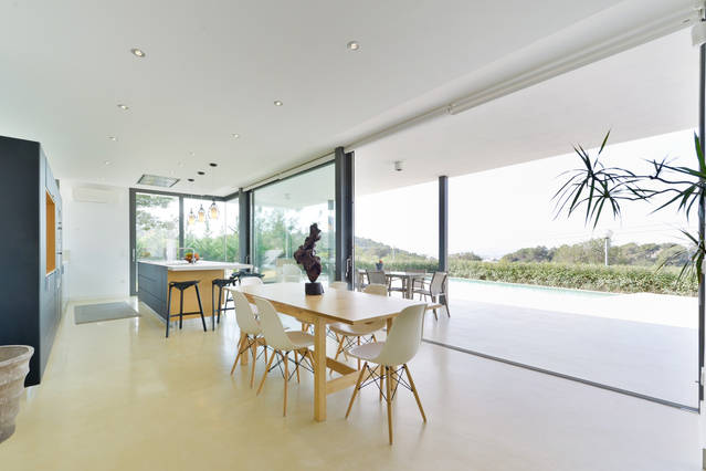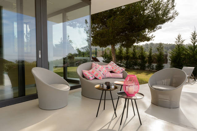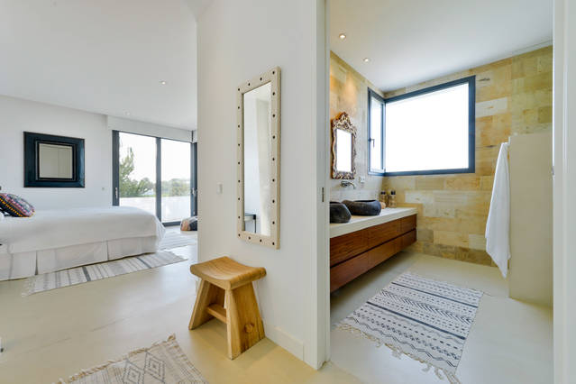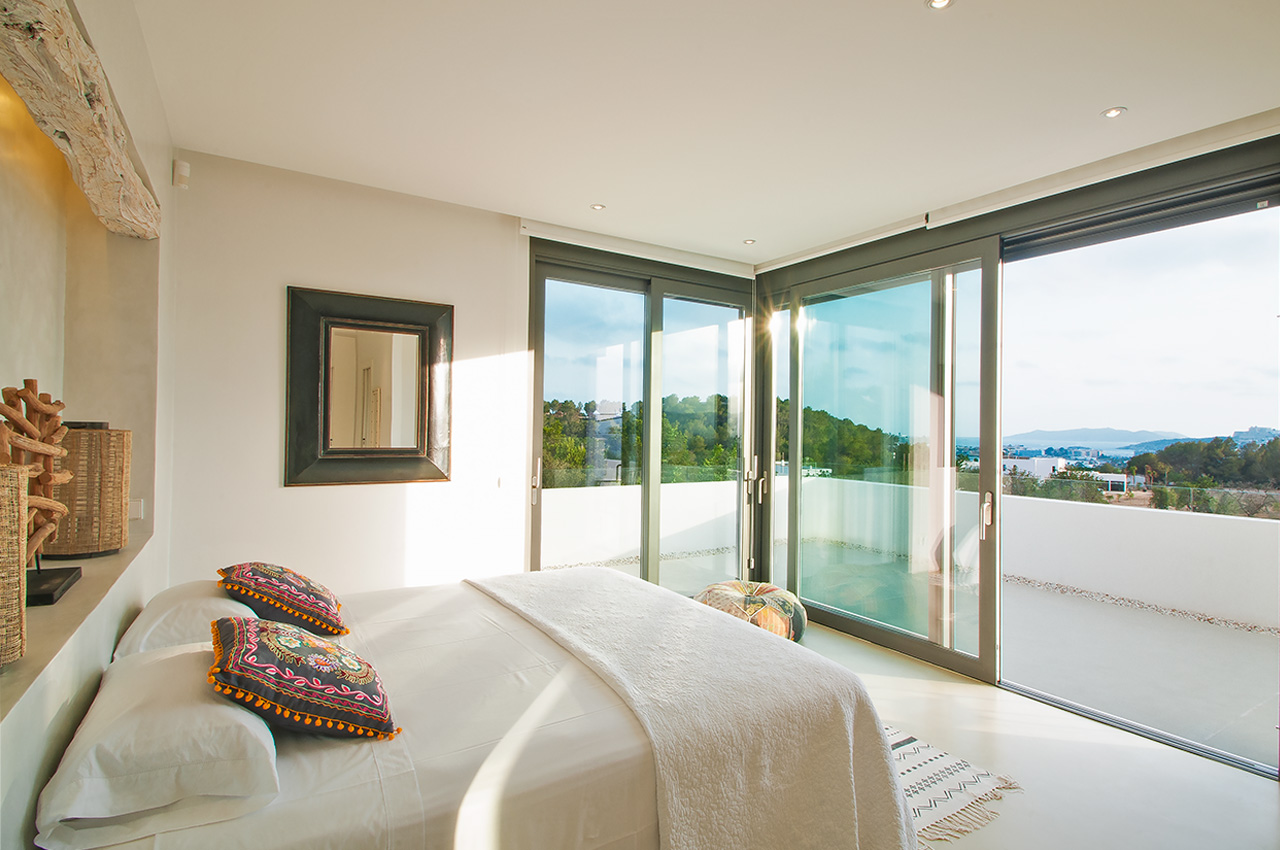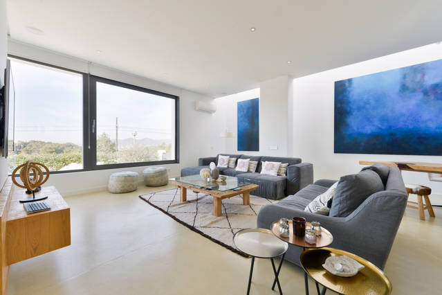 Situated on a quiet residential road, this villa in Ibiza offers tranquility whilst being conveniently placed for easy access (5 min) to Marina Botafoch, Talamanca Bay and the historic old town of Ibiza (10 min). Also close to Sestanyol beach. The cool interiors were designed to meet the practical needs of modern life while using the noblest materials to soothe the senses: concrete floor, bathroom made with natural stones, etc. Modern house with sea views, located in the countryside and close to Dalt Vila Castle.There is a big kitchen, big living room, large entrance, laundry room, store room, barbecue, garden and swimming pool. Fully equipped kitchen, great living room Smart TV, WIFI (Fibre optic), A/C, safe box and alarm system, laundry room. Outdoor hot showers for maximum poolside comfort, various terraces, and areas for sunbathing. Infinity pool with salt system and jacuzzi to enjoy a relaxing day.This house is located one of the most prestigious areas on the island. Enjoy the lovely view to the castle and sea view, very close to town.